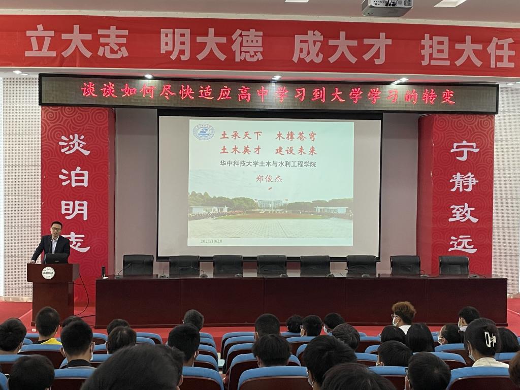 (通讯员 潘将军)10月28日下午,华中科技大学教授、长江学者郑俊杰为土建学院大一学生作题为《如何尽快适应高中学习到大学学习的转变》的报告。郑俊杰结合自己的教学经历,告诫同学们“规划好自己大学生活”的必要性,提醒同学们应该从大一开始制订明确目标,保持高中阶段的自律,远离手机游戏,多参加体育活动、社团活动,丰富自己的大学生活,努力成长为一个对国家,对社会有用的复合型人才。