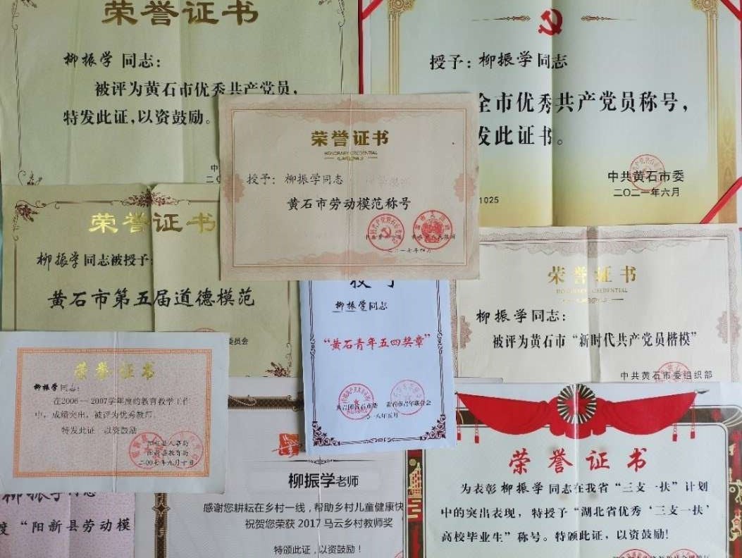 16年来,柳振学获得过许多荣誉。作为党龄15年的老党员,在中国共产党成立100周年之际,再次获得“黄石市优秀共产党员”的称号,刚刚家访回来的柳振学难掩激动,拿在手里翻来覆去地看,家访一天的疲累荡然无存。
