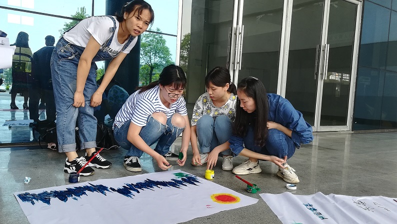 本次活动分为五个小组,由17级与16级的同学们组成。活动开始,组织者给同学们分发完纸笔颜料之后,纷纷动起手来,展示着自己的画功。同学们各尽其力,有的用手掌沾满颜料,张开五指在画纸上勾勒着,还有的用画笔在上面不停的点缀。其中一个小组的作品是一幅梅花:笔挺的枝干,绽放的腊梅,飘散在空中,好一副动人画面。还有一组则是 一片松林:烈日当空,唯有青松永远翠绿不朽。创作过程中,同学们一丝不苟,活动持续了两个小时,各组都完成了自己的作品。最后每个参赛者在横幅上签名留念,每组的作品也将以投票的方式进行排名公布并分发活动奖品。