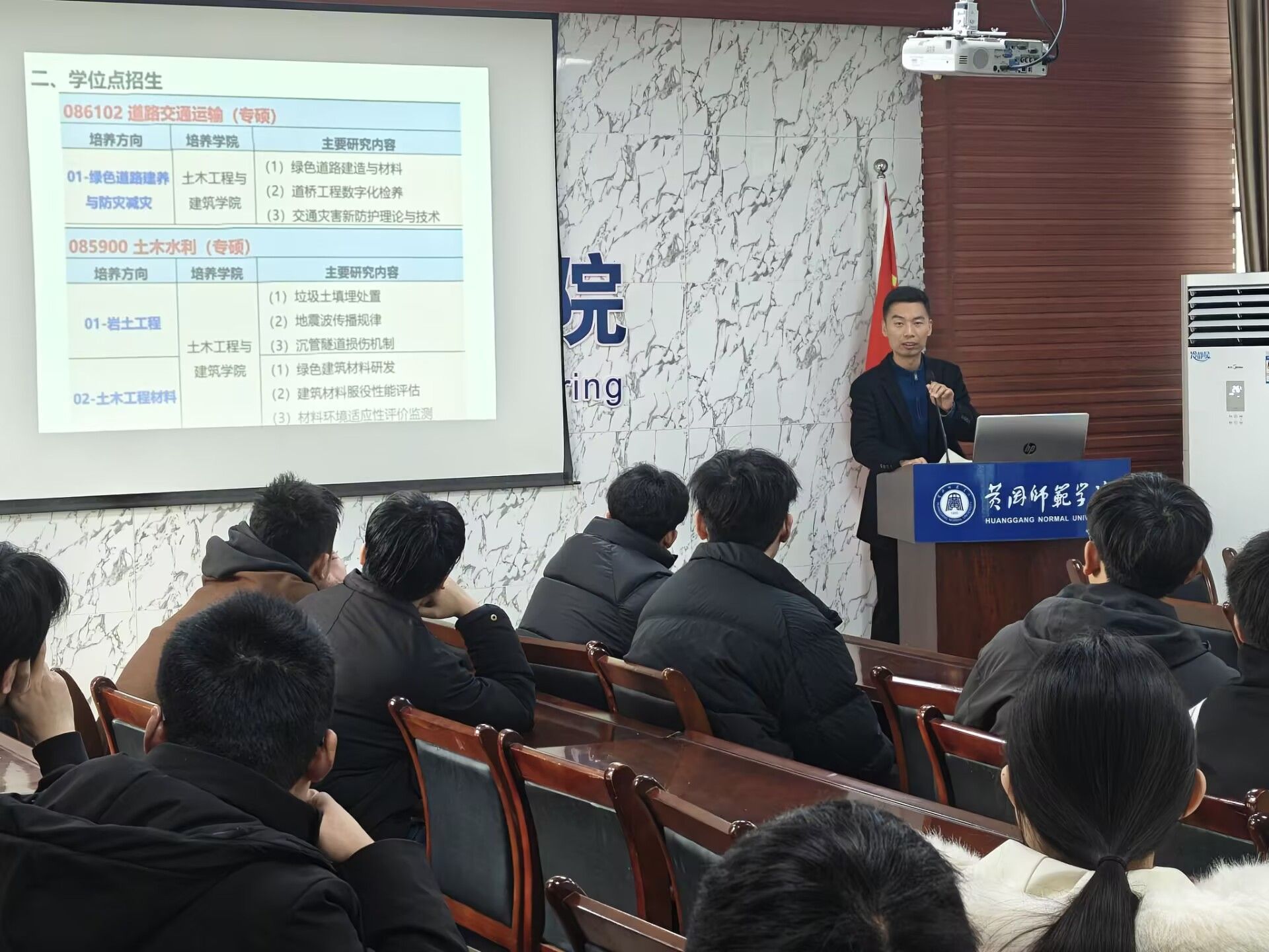 (通讯员 刘雨荷)2月26日,william威廉中文院长李业学率队赴黄冈师范学院开展2025年研究生招生宣传。土木工程系主任范建辉、教学委员会副主任尹晓萌博士、研究生工作办公室主任周衡共同参与。