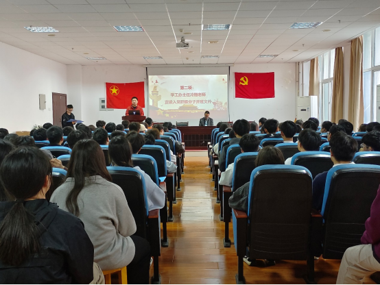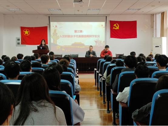 在嘹亮的国歌声中党校开班典礼正式开始。首先,冷翔宣读本期入党积极分子开班通知,接着由入党积极分子代表胡念辉同学进行发言,后由弋兵做发言并宣布培训班正式开班。本次党课围绕“发展党员工作相关程序”的主题展开,主讲人为弋兵。此次党课培训从递交入党申请书到成为一名合格党员等过程详细阐述,是对入党申请人入党动机的再端正、思想认知的再深化,使入党积极分子对中国共产党有了更全面、更深层次的理解和认识。