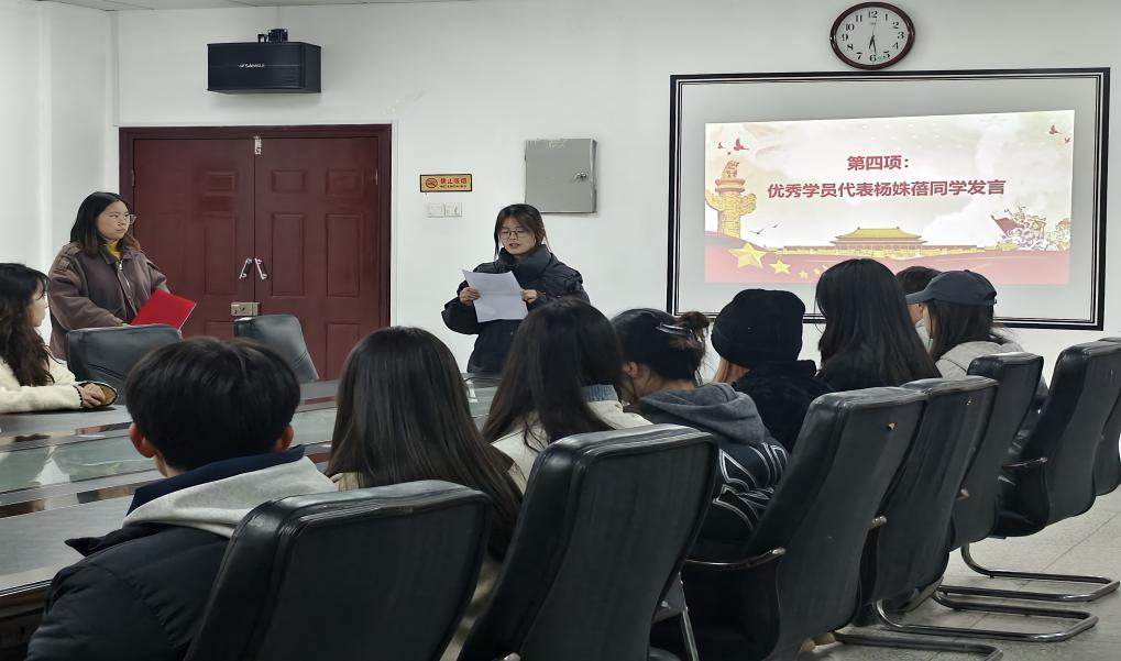 活动开始全体起立奏唱国歌,全体成员声音洪亮、精神饱满,接着由刘雨荷老师宣读结业名单和优秀学员名单,优秀学员代表杨姝蓓同学发言,最后弋兵书记对本期党校进行工作总结并宣布此期培训班结业。