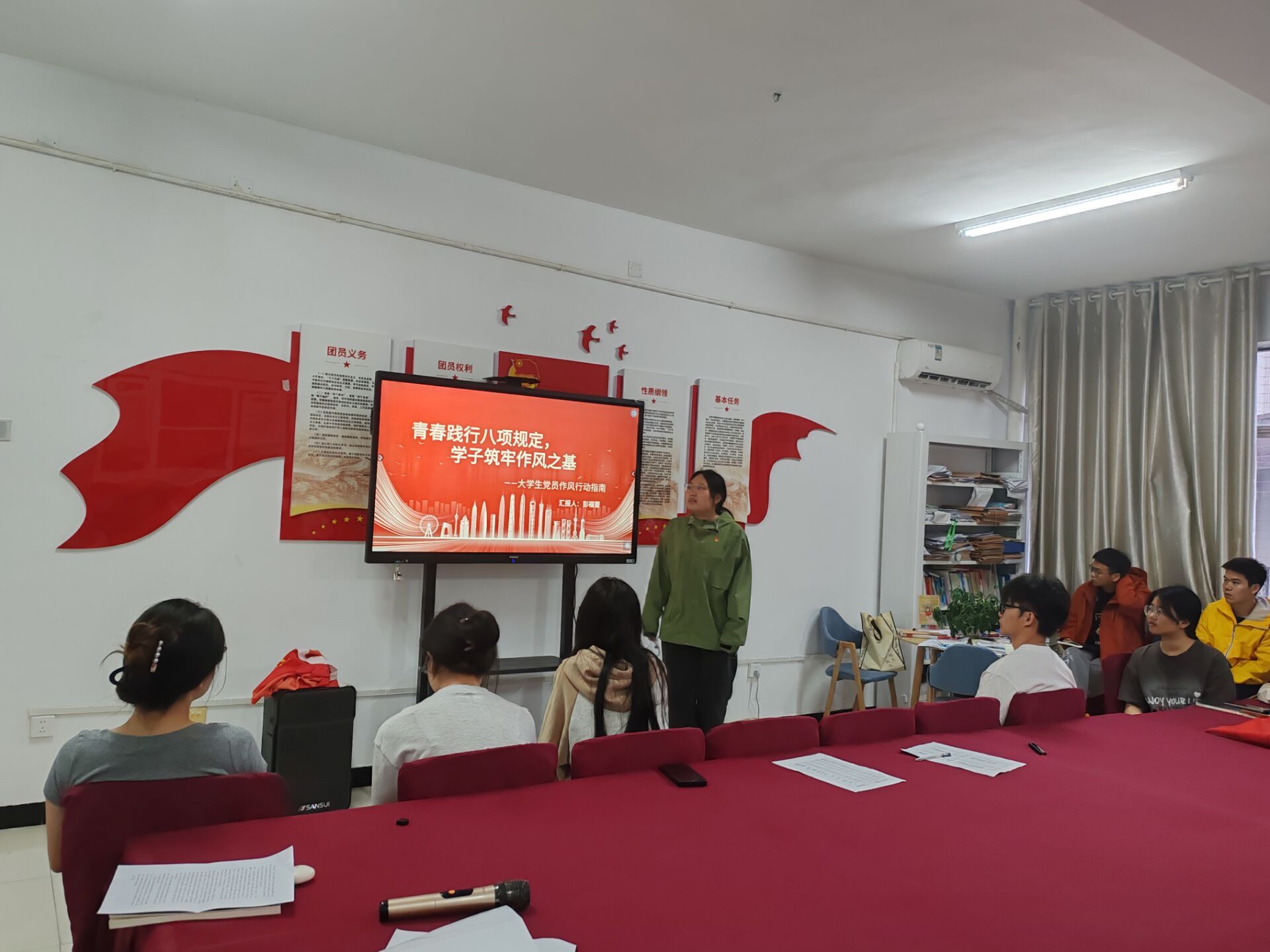 本次党日活动围绕八项内容展开。第一项:全体起立,奏唱国歌《义勇军进行曲》;第二项:全体学生重温入党誓词;第三项:由危劲怡同志带领大家学习诵读《中国共产党章程》;第四项:由土木工程系学生党支部张家怀分享学习心得;第五项:由建筑与城市更新系学生党支部彭福蕾为大家讲解以“青春践行八项规定,学子筑牢作风之基”为主题的党课,主要内容为:新时代作风建设旨在提高党的执政能力和领导水平,确保党始终成为中国特色社会主义事业的坚强领导核心;第六项:各支部交流发言,魏然,黎璐璐和尚天卉三位同志依次发言;第七项:各支部小组围绕党日活动主题相互讨论,分享学习心得;第八项:组织各位党员将本月党费交给支部助理。