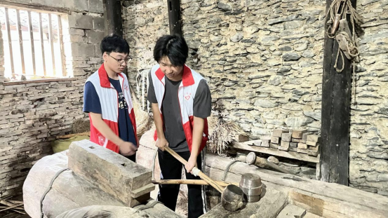 图为志愿者亲身体验古法榨油过程,深入了解当地的古法榨油技艺。土建学院通讯员 姜东方 供图