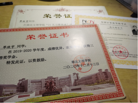 课外,她加入多个学生组织、社团,积极参加校运动会,做过辩论赛主持人,在晚会表演过节目等,这些活动让她的校园生活丰富多彩,她坚信这些经历能够让自己有所收获。在此期间先后通过了计算机二级、大学四级等考试。毕欣宇时刻提醒自己“业精于勤而荒于嬉,形成于而思毁于随”。